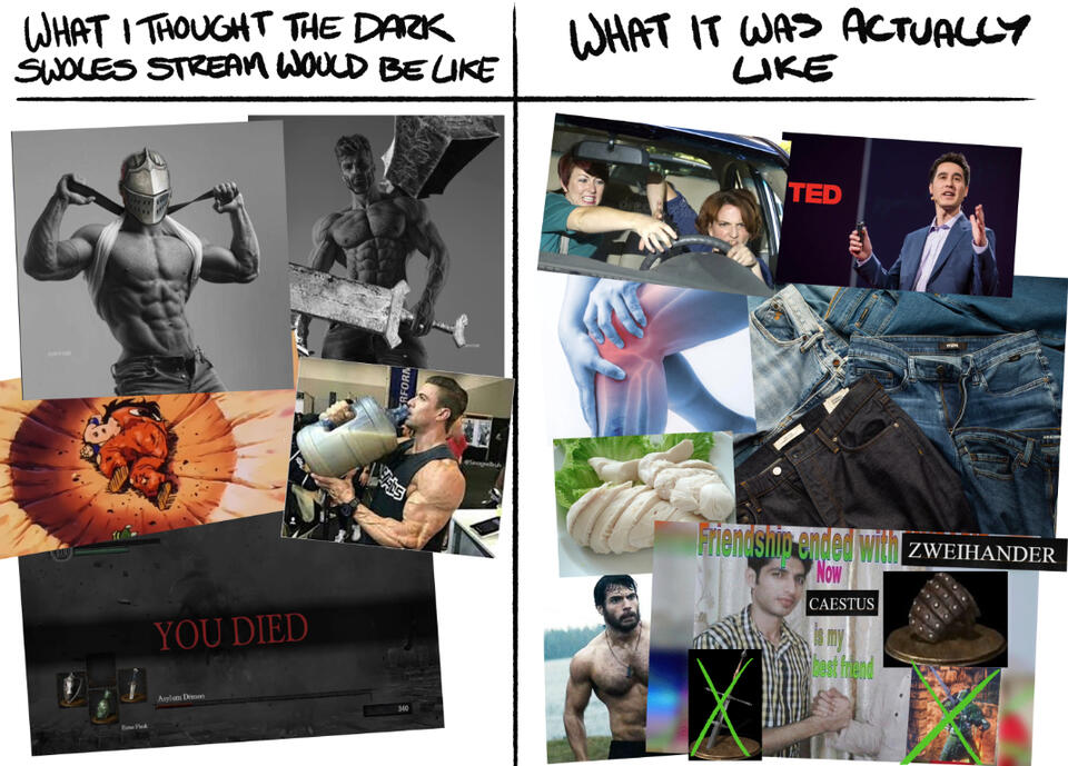 Josh wishes to get swole while taking souls. You can participate at home as much or as little as you'd like!Josh has made a new channel, Josh Strife Gains, for videos about the challenge, how it develops over various streams, and a director's cut of each game.